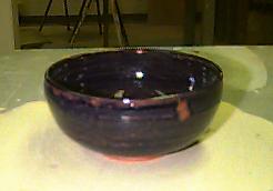 This is a bowl I made in Ceramics II. It was one of the pieces that was in my kiuln at home when I fired it for the first time. I was able to achieve a nice effect on this one with the glaze. It's a red clay body underneath, and I put clear glaze on it and then put a cobalt carbonate wash over that. The end result is a sort of mottled dark blue, with a bit of red peeking through here and there. Again, I appologize for the picture quality. |