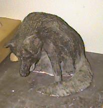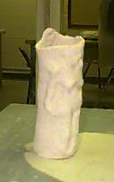 Here we have the (unfired and unpainted) "Self Portrait." I had probably spent about 20 hours on this at the time the picture was taken, and I went on to spend five to ten more. I don't have any current pictures, but it was painted with underglazes in a sort of cartoony manner. My original idea was to have the surface be made up of small icons and pictures with subtle coloring, to end up approximating from a distance whatever color it is I want to be in that area. Well, I ended up in a time crunch and decided to go the quick route and paint plain flat colors. I'm kinda disapointed that I couldn't do it how I wanted, but these things happen. After firing the underglaze to a low temperature (cone 020 or so), it now sits in my family's basement. Unfortunately, it's too big for me to fit in my own kiln, so I can't really do anything more with it for the mean time. Mother and Child